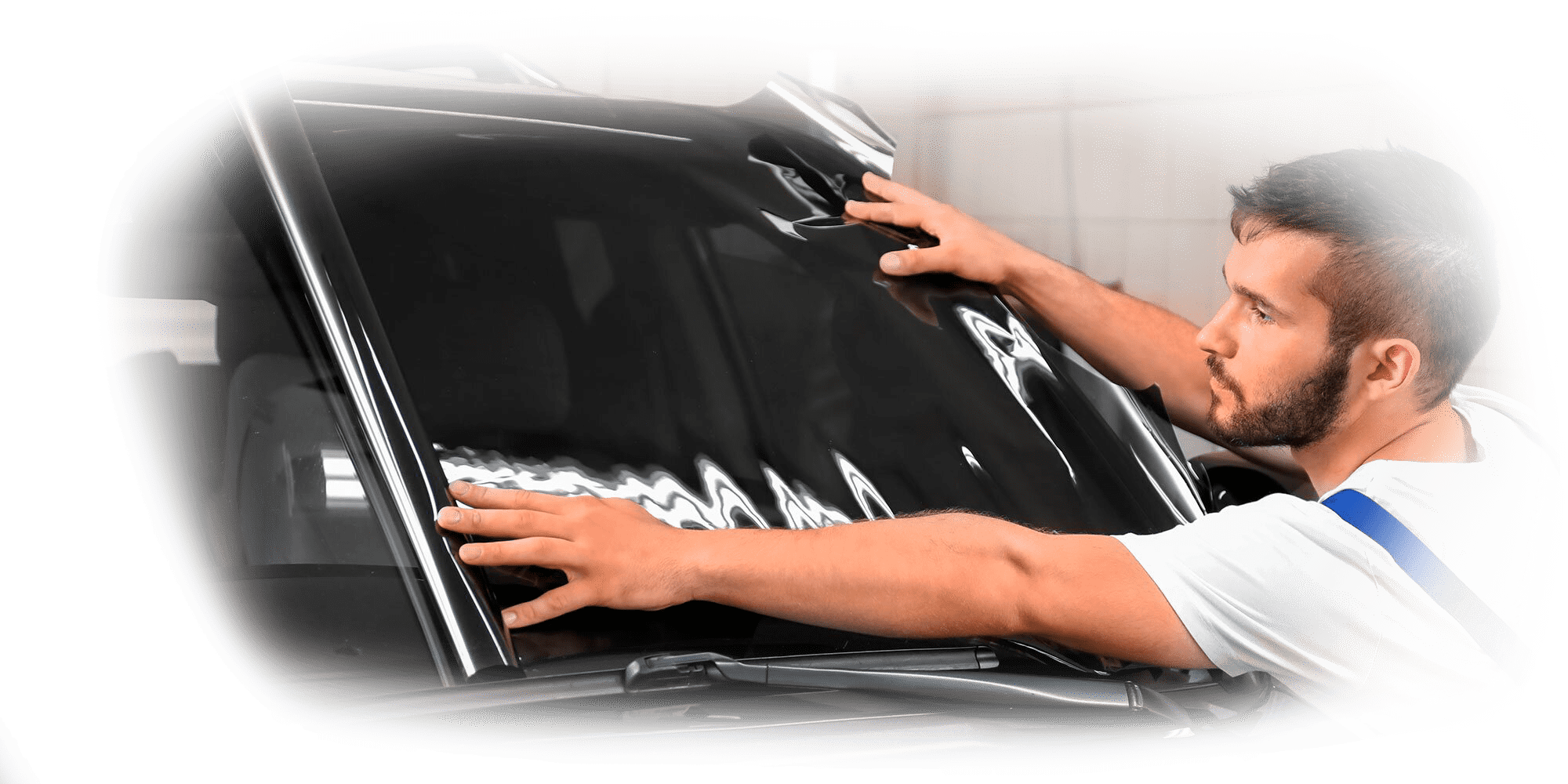 Стекло авто смачивают с одной стороны мыльным раствором и прикладывают пленку